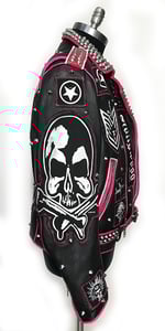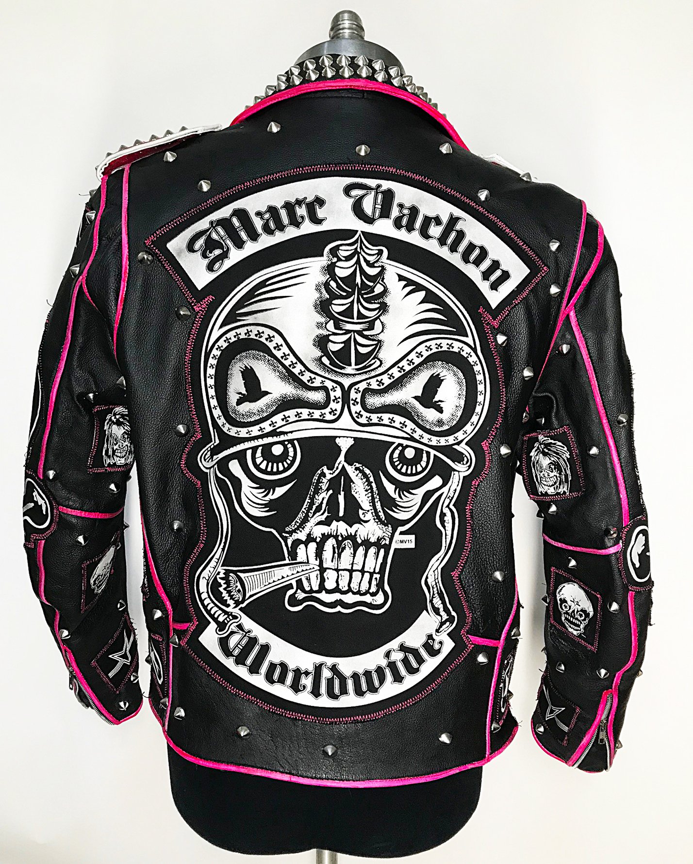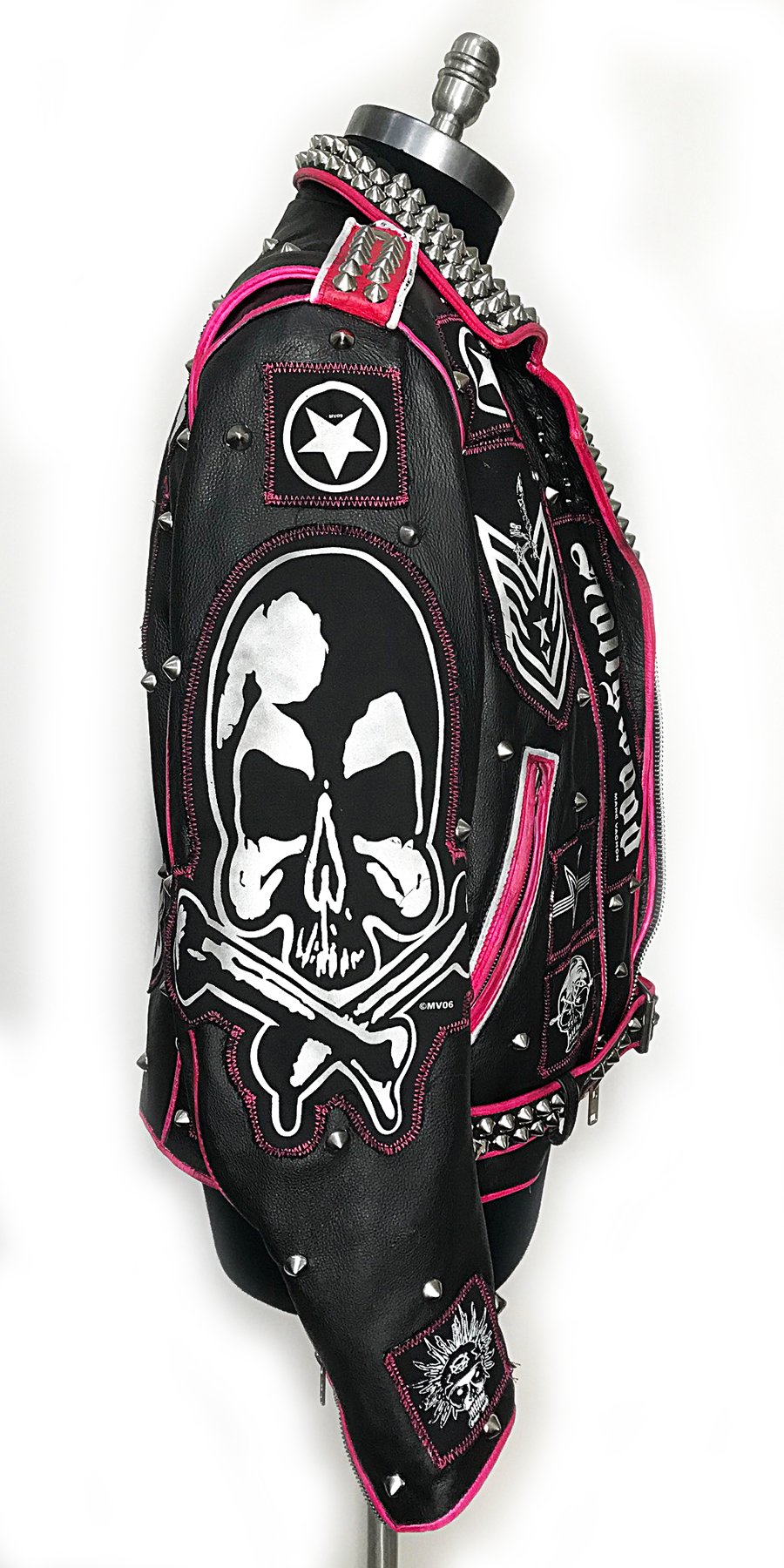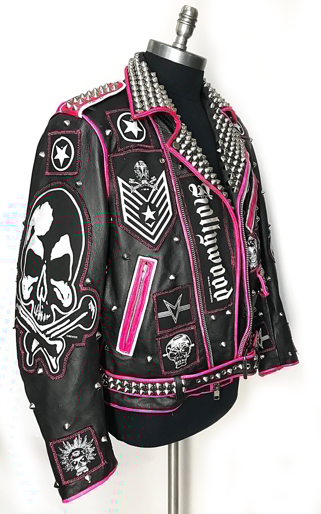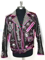Here's the all new Hot Pink Sargent Leather Jacket! Check out the all hand painted work and hand sewn patching in the details. The all silver studding against the bright pink hand painted leather pin striping really makes this jacket pop! Available in all sizes now. The are all made in Hollywood California and 100% Rock N Roll driven!