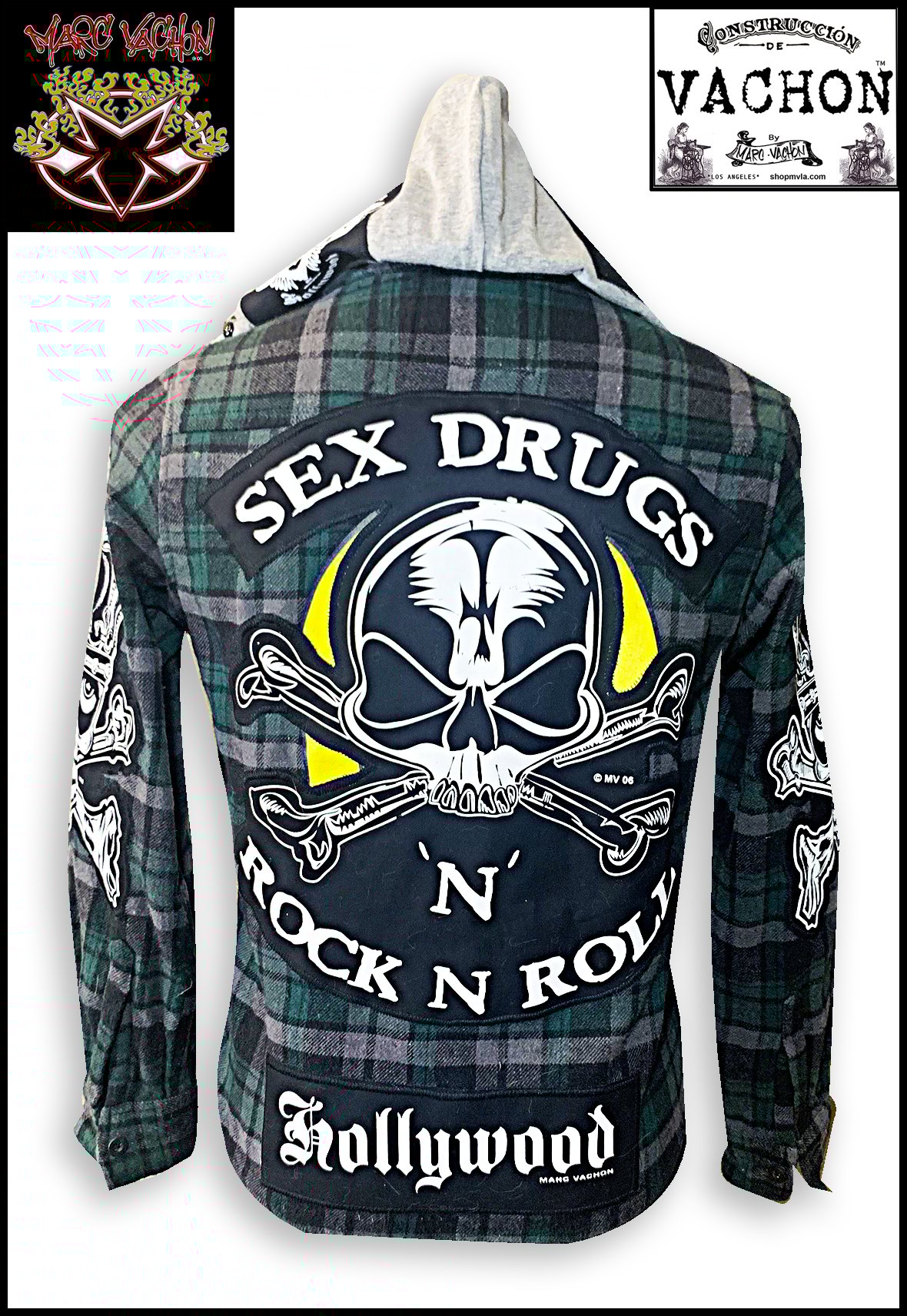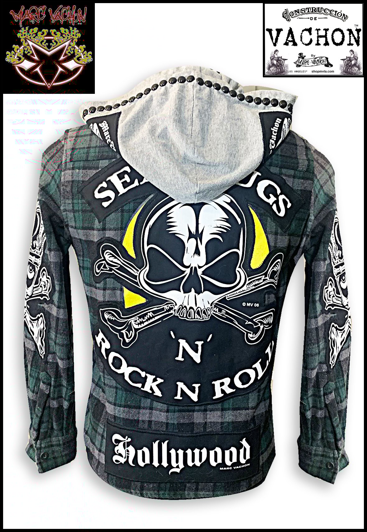 This style is a very specific and individually customized piece that will not be duplicated! This shirt is a size Medium and features those Marc Vachon custom patches with Frankenstitched detailing and hand studding.