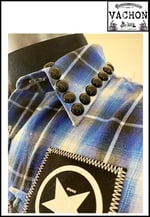 This shirt is a size Large and features those Marc Vachon custom patches with Frankenstitched detailing and hand studding.