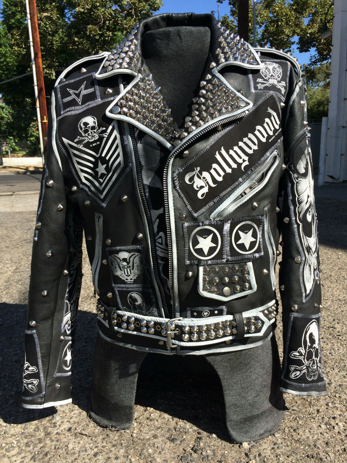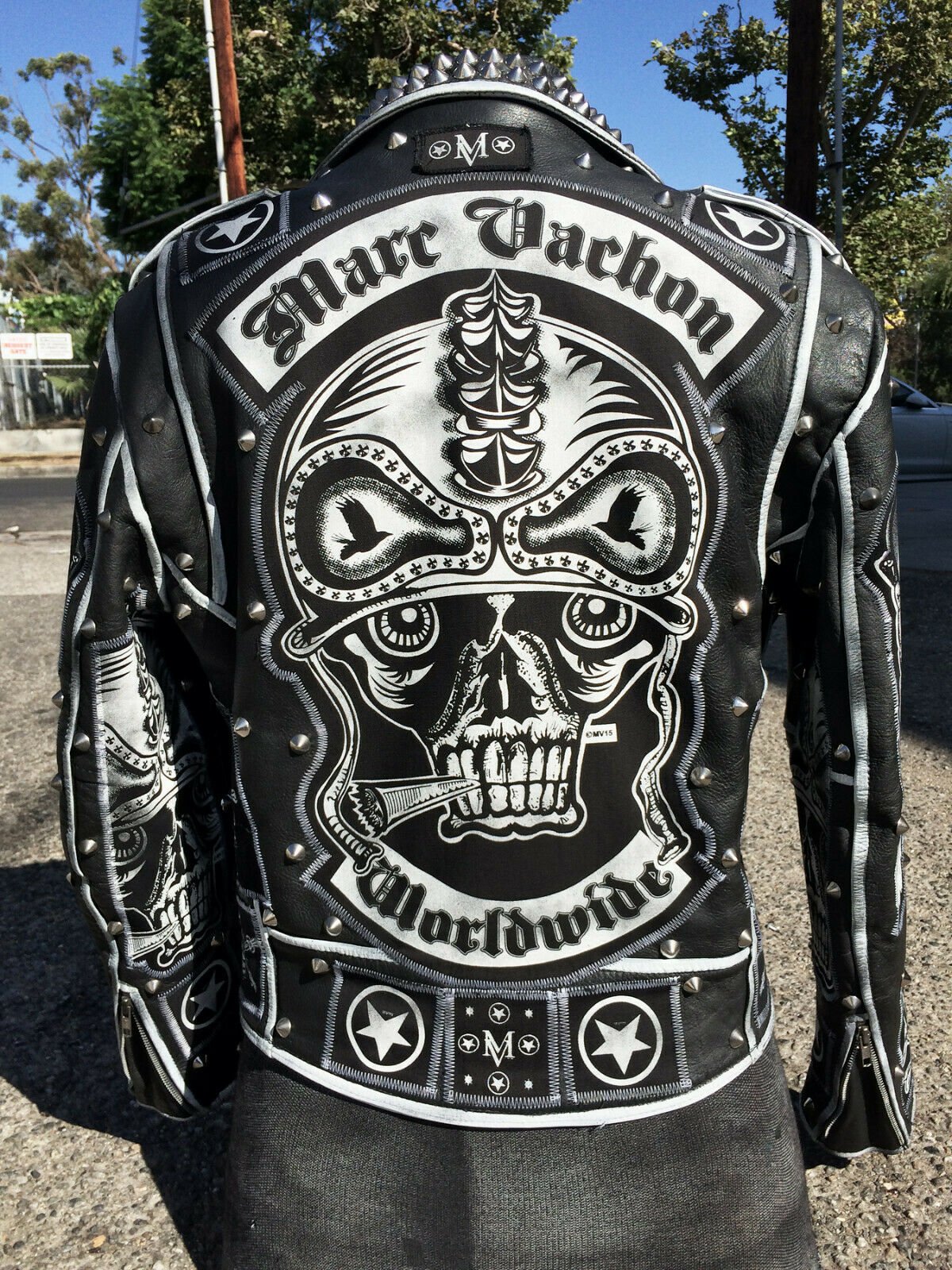 MV creates the ultimate custom painted leather jackets. This Marc Vachon Custom Sargent Blackout Leather Jacket is studded, patched, and sewn in L.A.. All nickel studs make this one stand out and is the perfect piece for the stage or street!. This MV piece is Super Customized for that "One of a Kind " look and feel! The cool all black studding here make this piece a real head turner! This is a great jacket for stage and those special appearances. You have seen Slash and all of your favorite bands rockin the MV style for decades! Now you can have a piece all of your own.