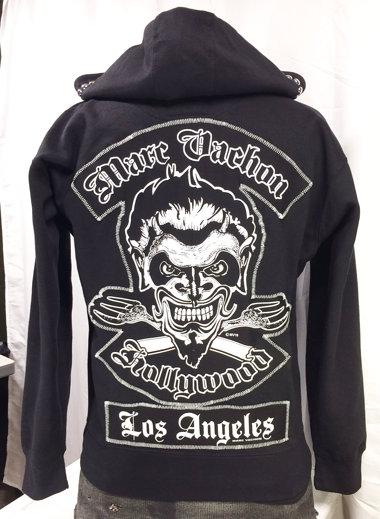 Straight outta Hollywood! The MV custom shop are proud to present these all new for 2023 stage pieces.. Here we have this great RARE Marc Vachon Custom Fork N Devil Frankenstitched and hand studded black zip hoodie featuring all the classic MV patches from back in the day with a present flare for that great unique and refreshing stage experience! Look like your favorite Rock Stars and get a piece of that original Hollywood Rock Star style here now. Please allow up to three business days for shipping. .