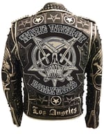 The MV BLACK MAGIC Master of Ceremonies Leather Jacket has a distressed and greasy beat up look on the patches and body. The hand painted white piping and hand set black studs make this mother f*cker stand out. Features the All NEW MV Master of Ceremonies Back Patch and a ton of mini and maxi patches galore. RARE and RAD.