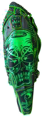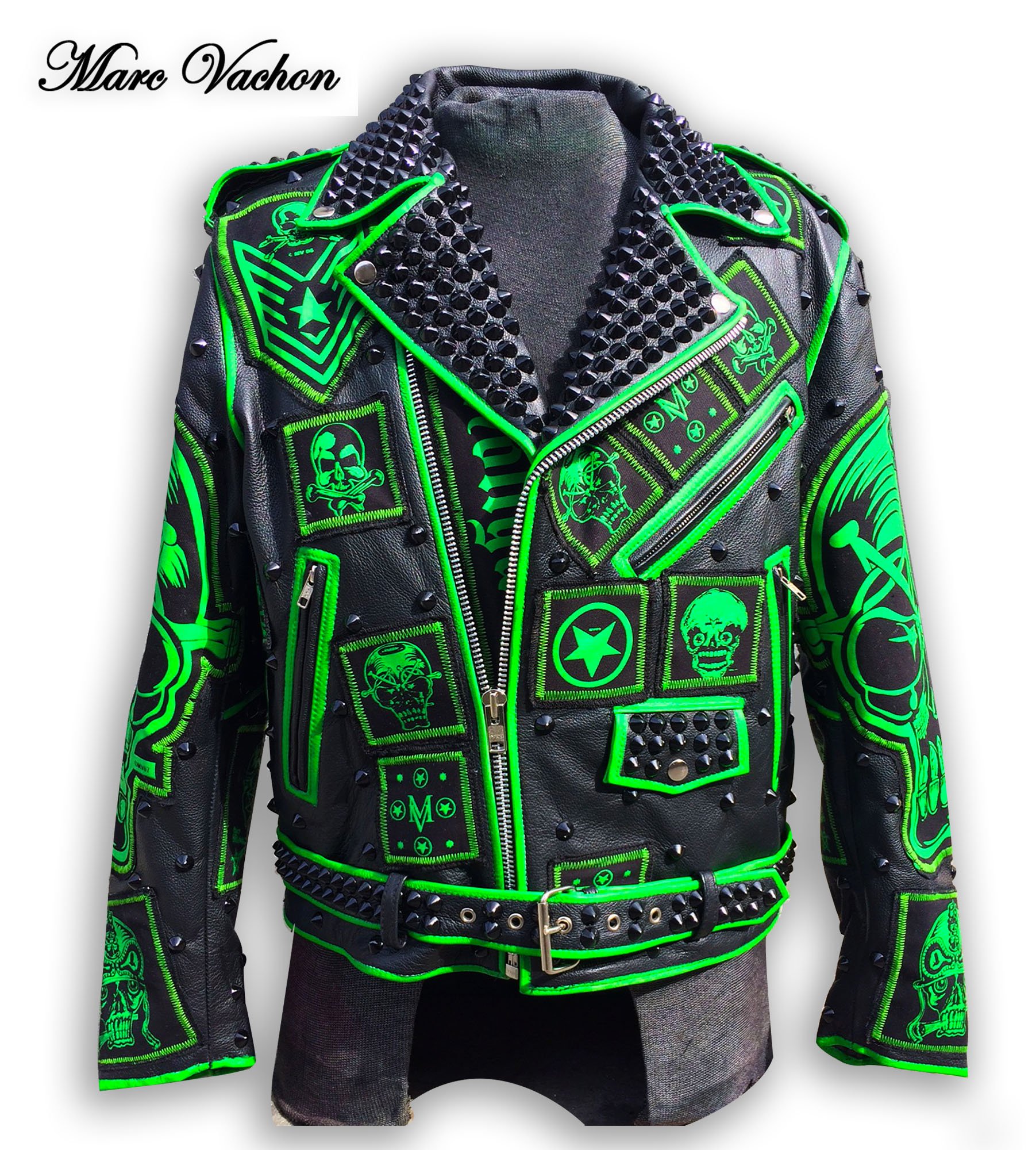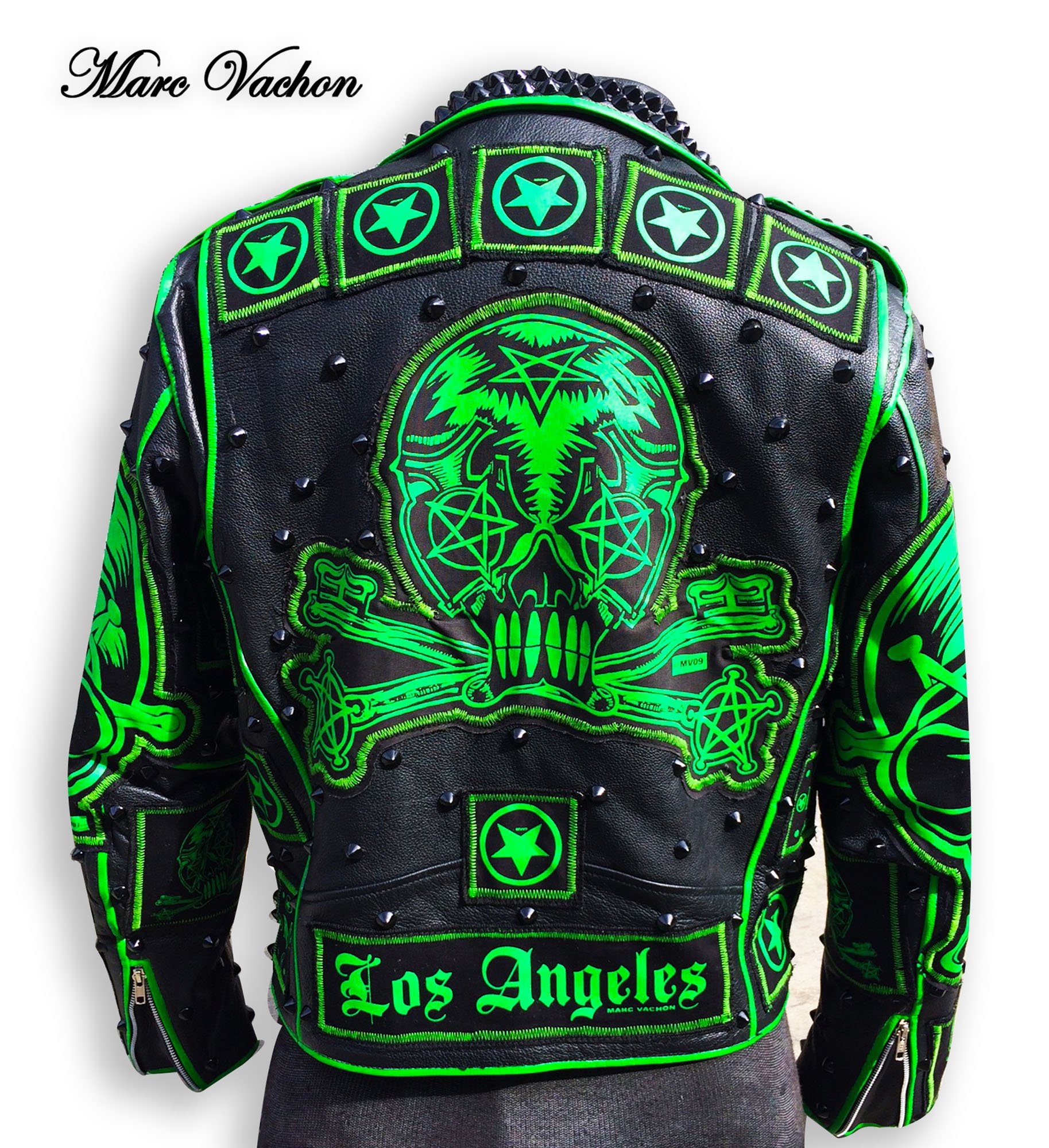 Here's the all new Rockin' MV Evil Green Machine Keybone Leather Jacket just in time for the Holidays. Check out the cool Neon Green pin-striping as well as the new Neon Green Ink on these patches . The all black studding really makes this jacket pop! Available in all sizes now. The are all made in Hollywood California with no complaints just 100% Rock N Roll! Please allow four weeks for delivery as this is a custom made to order piece.