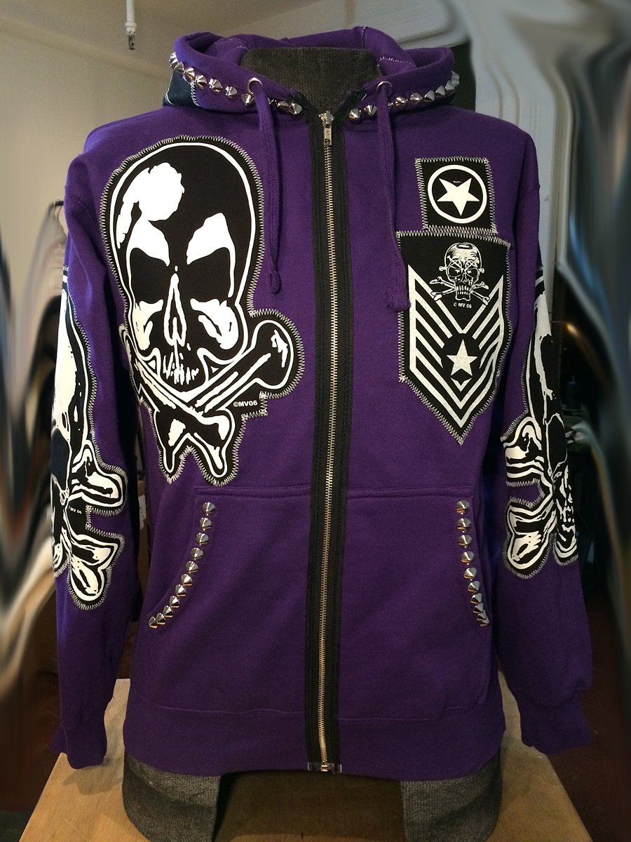 PURPLE PEOPLE EATER hoodie features an over the top sewn in black zipper on the front with the all new MV Sargeant patch on the back and an assortment of other classic MV patches. The cool silver hand studding ties it all together.