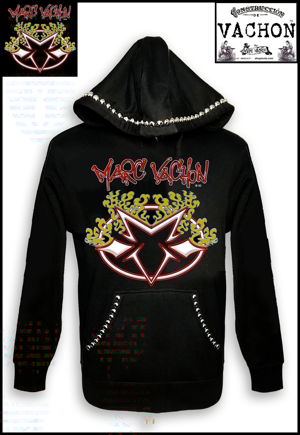 This is the original MV flame design from early Y2K that you saw Scott, Brittany, Papa Roach, Janes Addiction and so many others rockin! And the hand studding around the hood and pocketing are a MV OG classic!