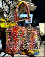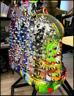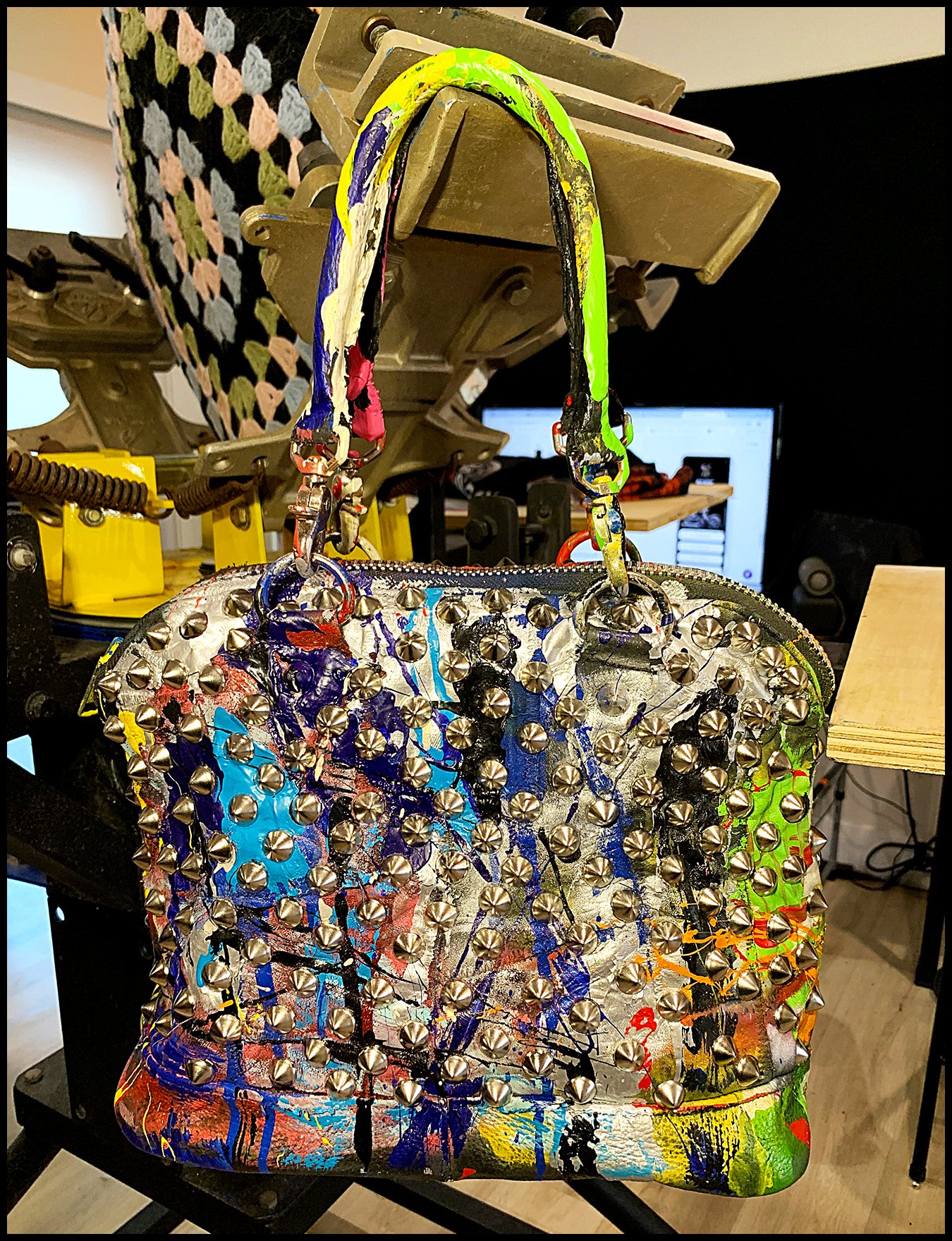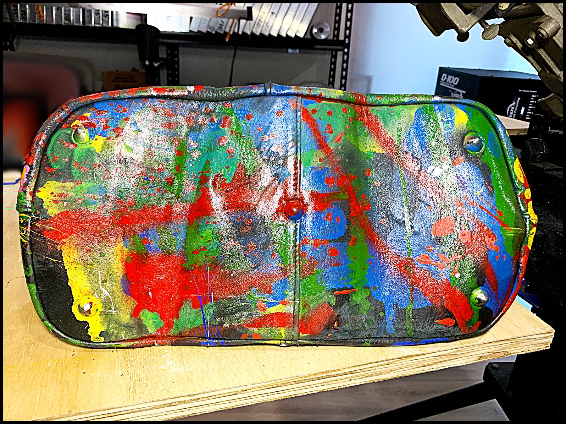 This one is sick! This familiar shape is made of all black leather patchwork to start. Mr. Ward has hand painted this one to get it that perfect acid splattered battlefield feel. This is a very rare and one of a kind piece that will not be duplicated. All hand studding done by MV in the Hollywood studios