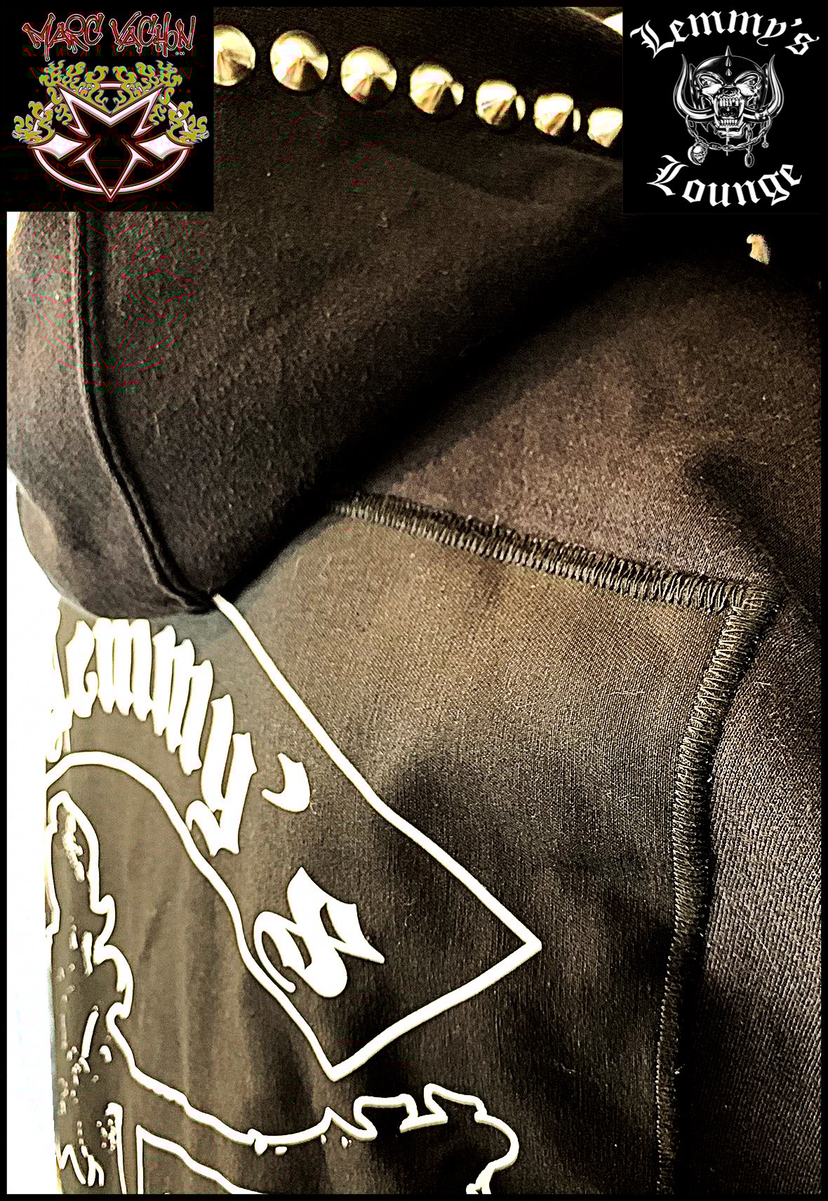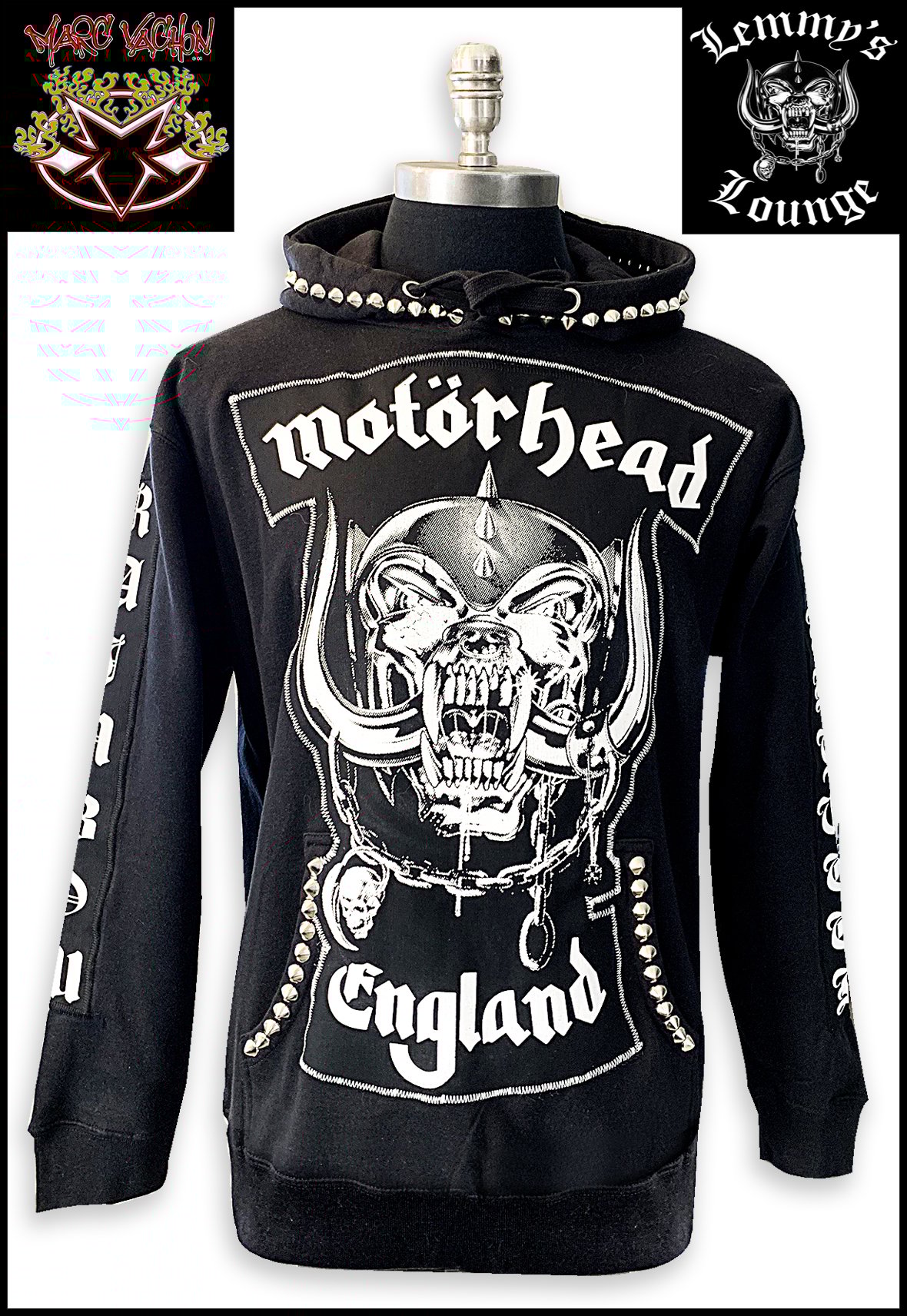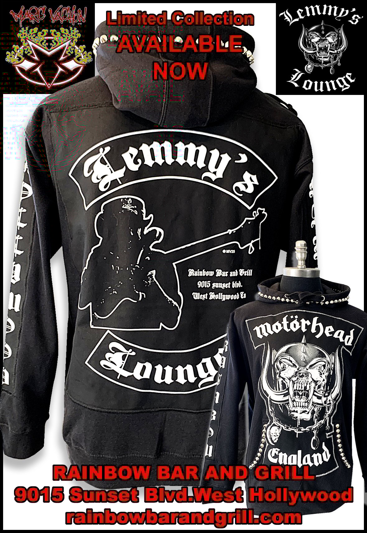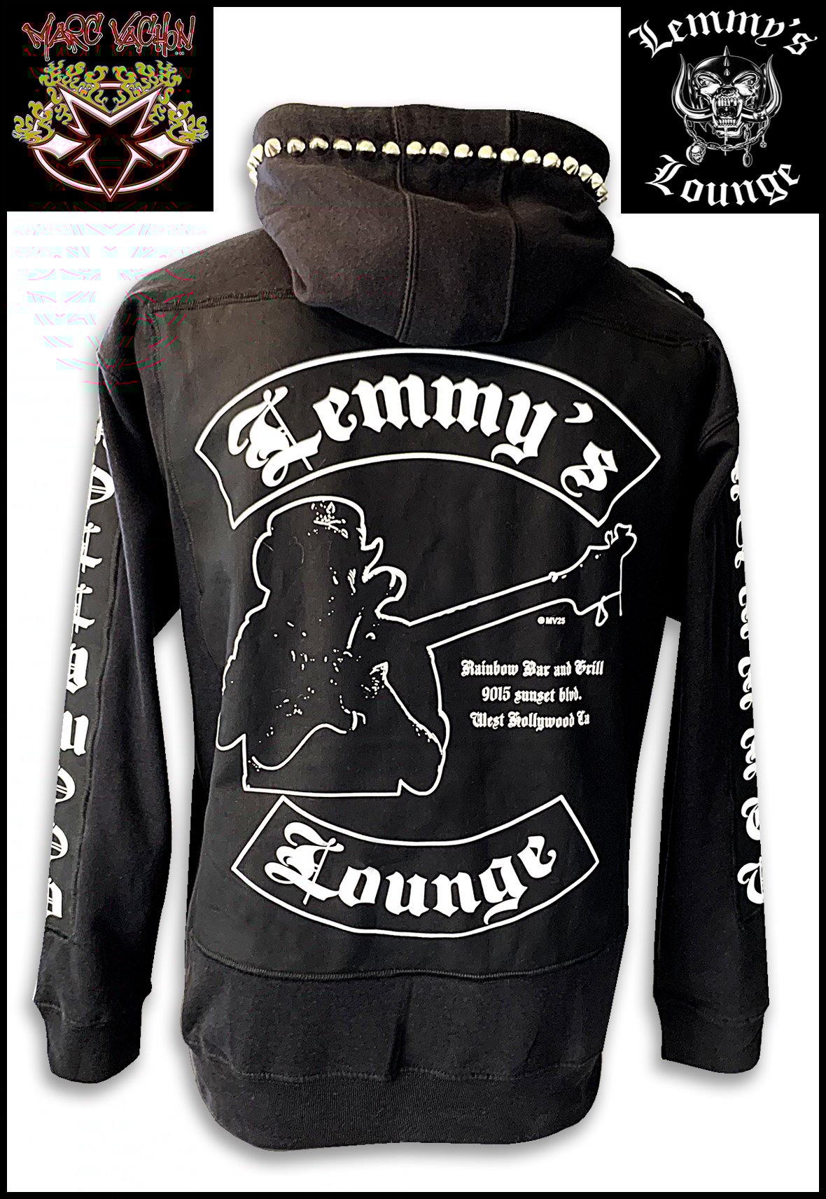 Introducing this very LIMITED EDITION Rainbow Bar & Grill – Motörhead pullover hoodie. Our first collaboration with fashion designer and musician, Marc Vachon! Handmade and studded, less than 200 will be made available.