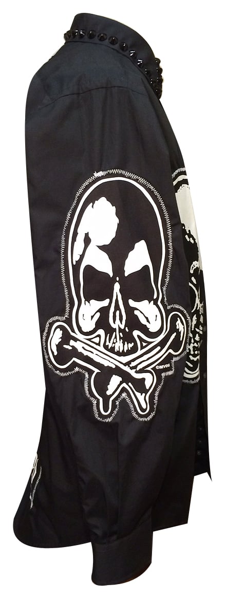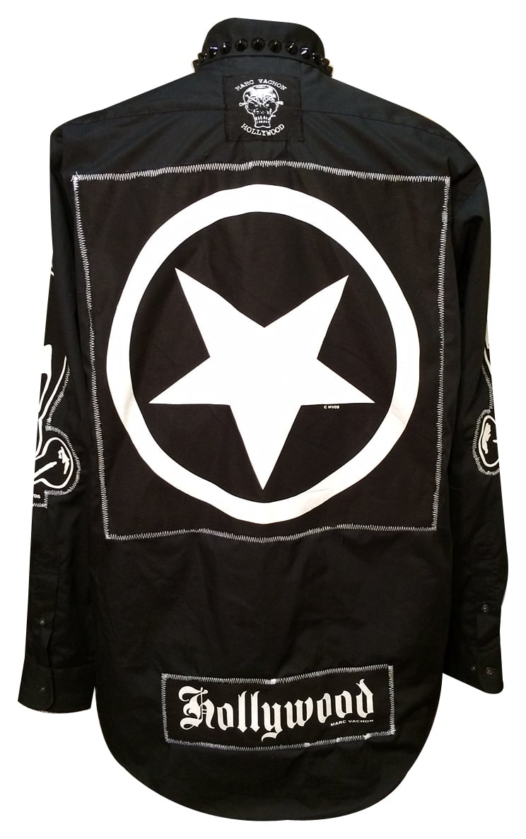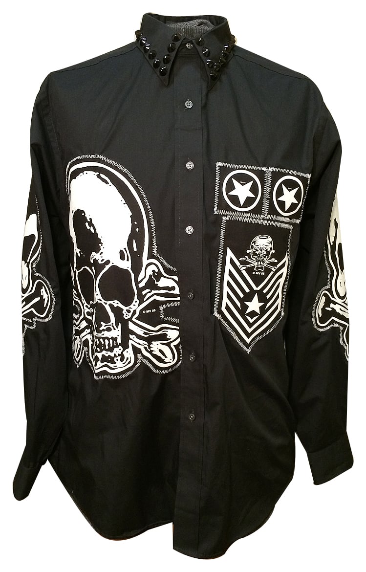 The MVGD long sleeve studded shirt has classic MV patches, custom Frankenstitching and black studs around the collar.